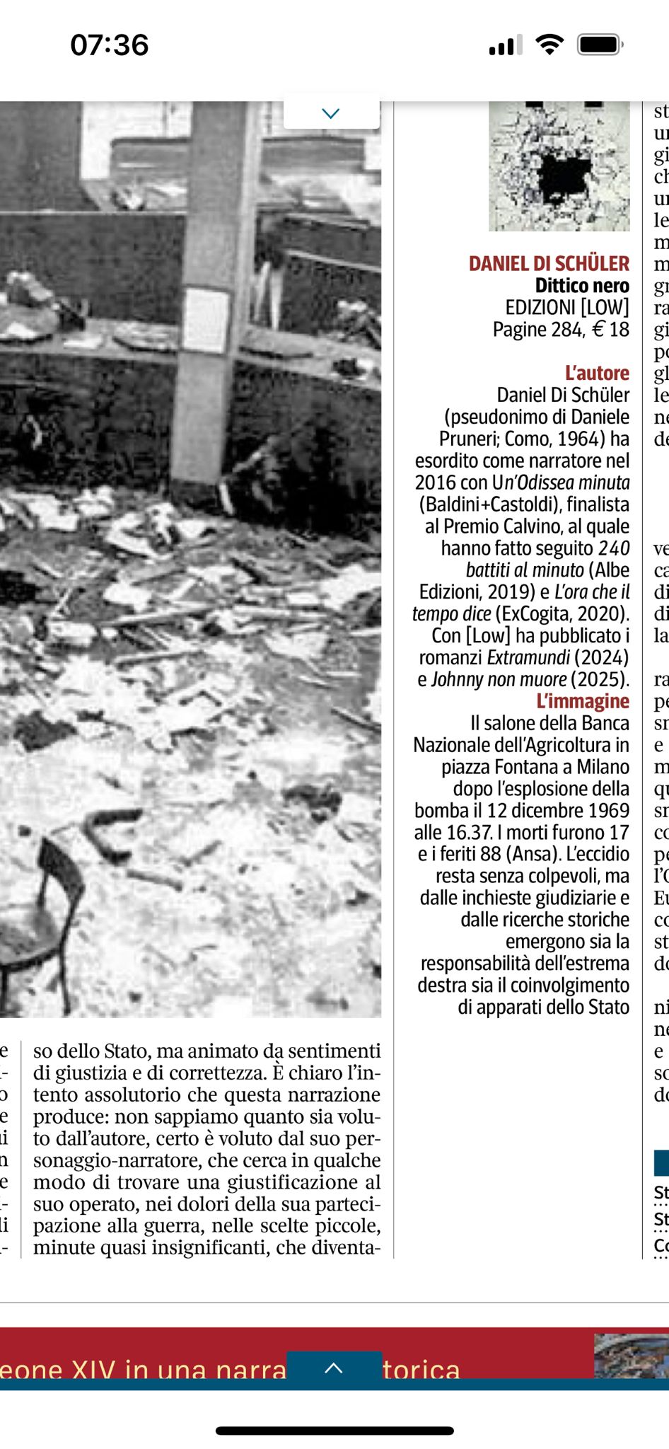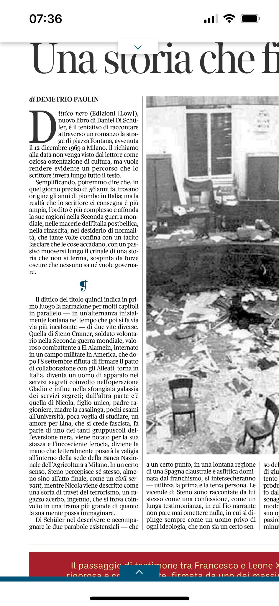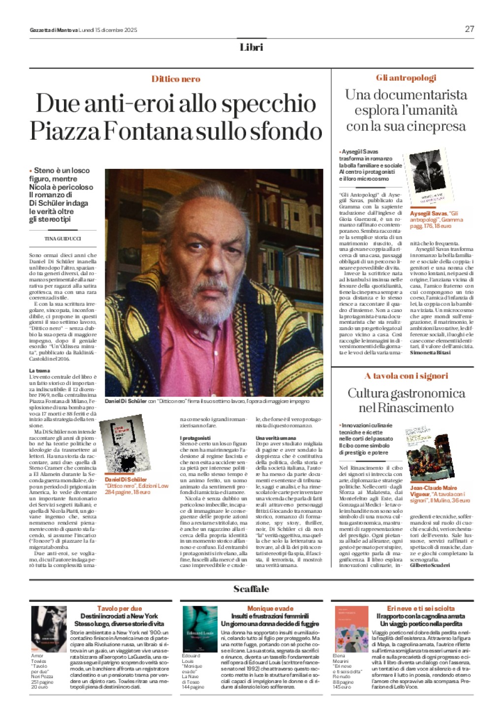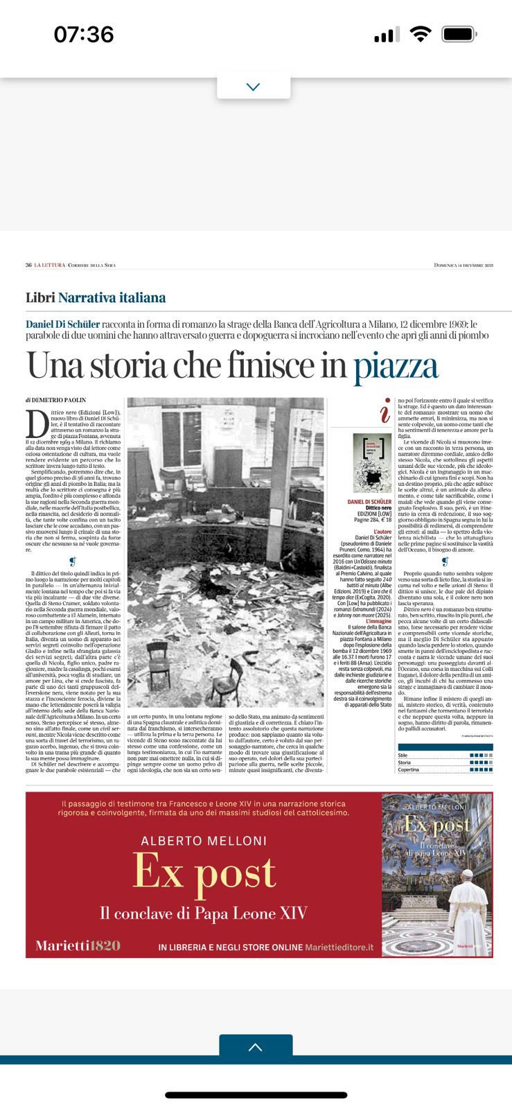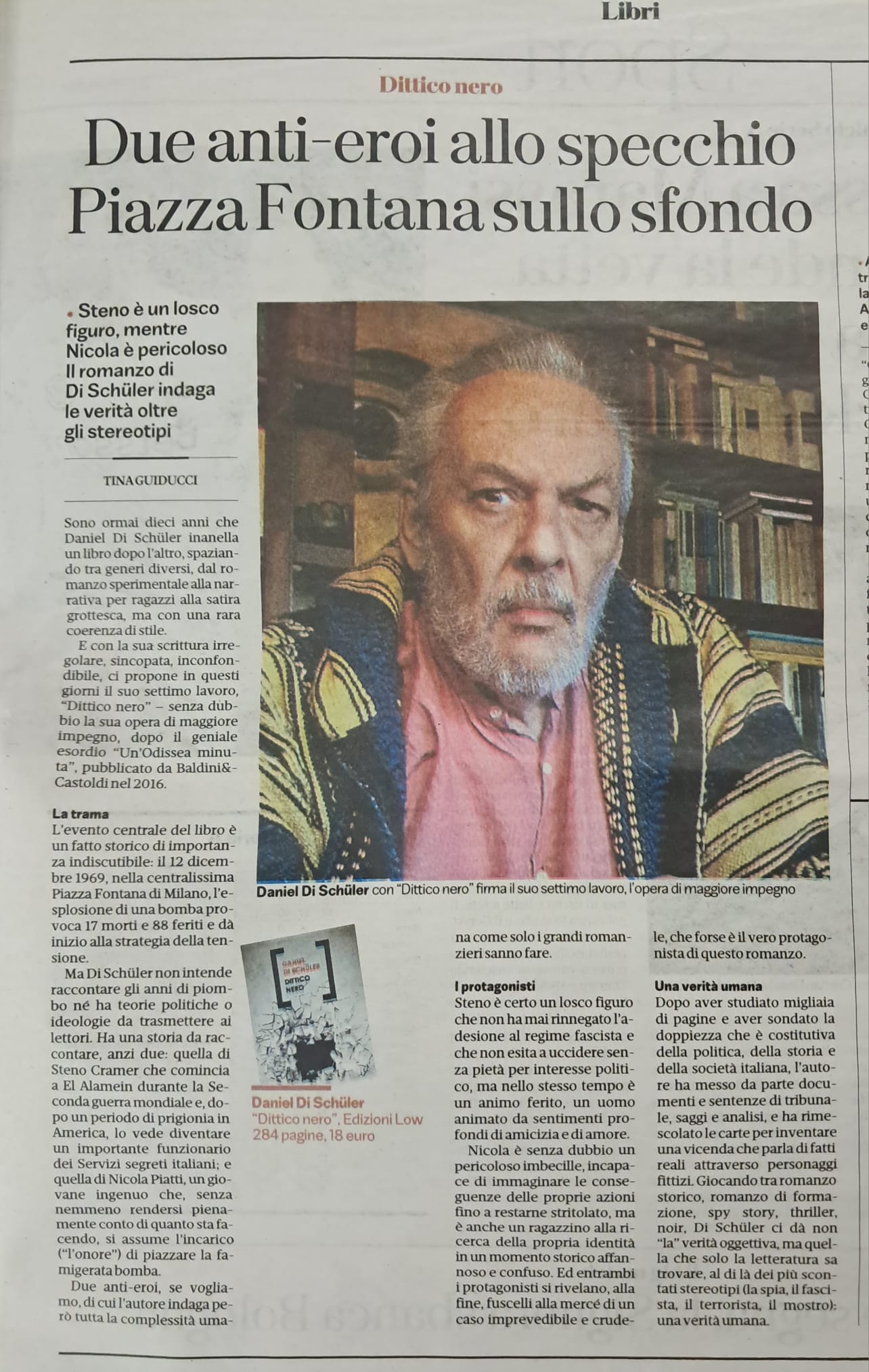 Daniel Di Schuler scrive il suo libro più intenso, tra romanzo storico, spy story e racconto di formazione, non per scoprire una verità assoluta su Piazza Fontana, ma per raccontare una verità possibile – una verità letteraria.