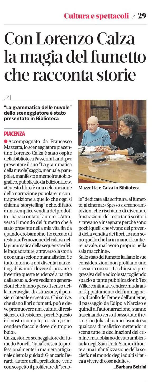 Lorenzo Calza (Piacenza, 1970) vive a Genova, dove sceneggia «Julia, le avventure di una criminologa» (Sergio Bonelli Editore) e disegna She, vignetta al femminile («il Fatto Quotidiano», Vanityfair.it). È inoltre autore di La grande madre, episodio della serie “Le Storie” (Sergio Bonelli Editore, 2015) e di Arkhain, miniserie di fantascienza (Marvel Italia, 2000). Nel 2019 ha vinto il Premio Coco come miglior sceneggiatore italiano.