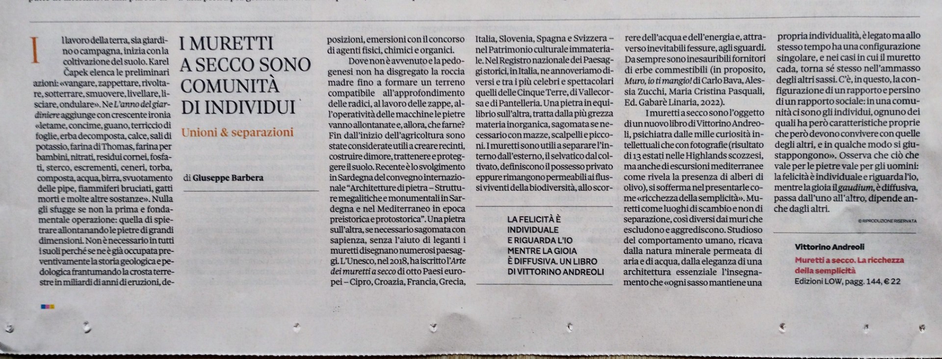 Inoltre – in un tempo in cui i muri servono sempre più a dividerci dal “diverso”, da chi non è come noi, da chi temiamo e vogliamo tenere fuori – i muretti a secco rappresentano al contrario un’imprevista possibilità di unione. Bassi e discontinui, permettono infatti di vedere al di là. E a volte si rivelano sorprendentemente resistenti.